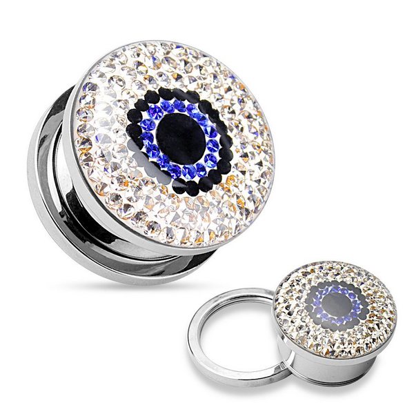 Плаги из хирургической стали 316L с изображением глаза, выложенного мелкими кристаллами под эпоксидной смолой.