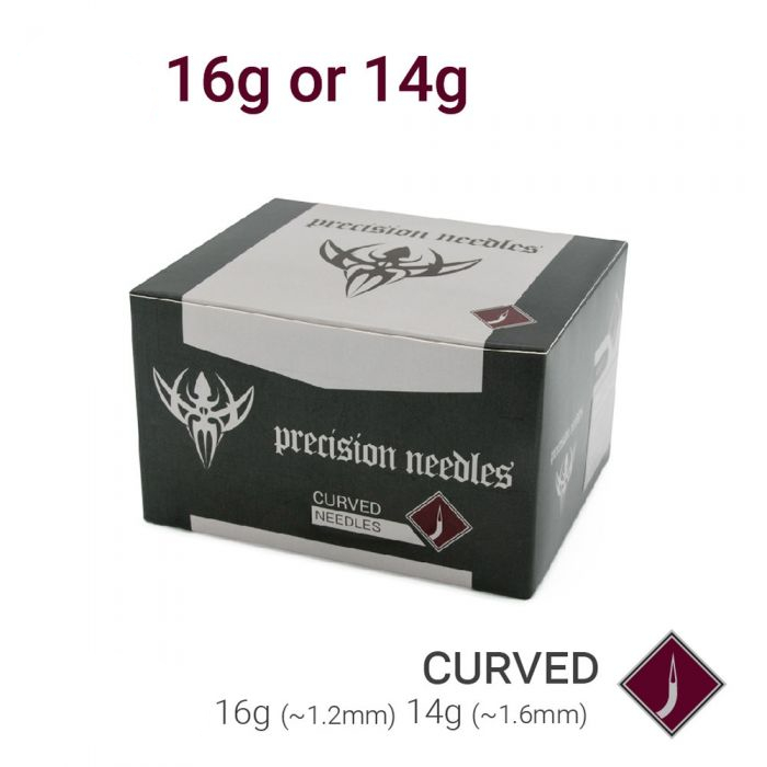 Профессиональные, изогнутые, стерильные иглы для пирсинга из 316L ASTM F-138 стали в индивидуальной упаковке. Заточка игл произведена лазером с трех сторон, что является огромным преимуществом перед катетерными иглами.