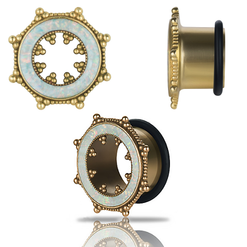 Тоннели из латуни, украшенные белым лабораторным опалом.
