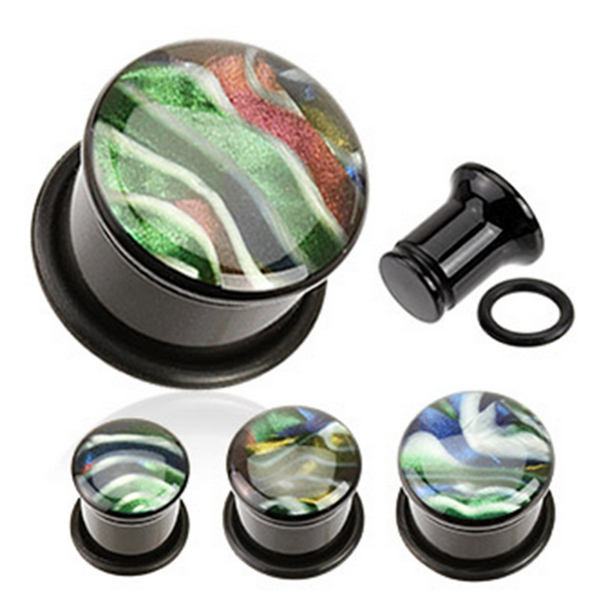 Литые плаги из акрила с резинкой-фиксатором, украшенные абстрактным перламутровым рисунком.