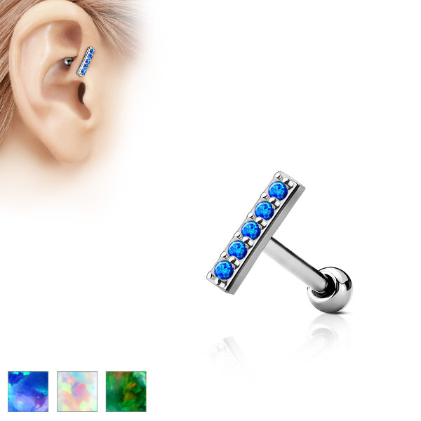 Микроштанга из хирургической стали 316L с кластером из пяти лабораторных опалов на родированной латунной основе.