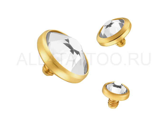 Накрутка из имплантационного титана ASTM F-136 с золотым 24х каратным PVD покрытием. Украшена кристаллом Swarovski. Резьба накруток 1,2мм подходят к микродермалам и украшениям толщиной 1,6мм с внутренней резьбой. Диаметр накруток: 3, 4, 5 и 7мм.