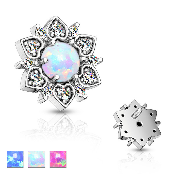 Наркутка диаметром 8мм из хирургической стали 316L и латуни украшена искусственным опалом в окружении 12ти фианитов. Резьба накруток 1,2мм подходят к микродермалам и украшениям толщиной 1,6мм с внутренней резьбой.