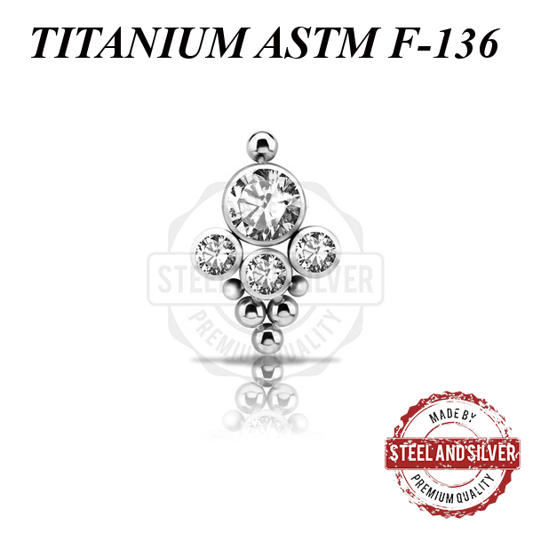 Кластер из имплантационного титана 6Al-4V-Eli ASTM: F-136. Украшен кристаллами Swarovski диаметром 4 и 2мм. Подходит для декоративного дополнения кольца.