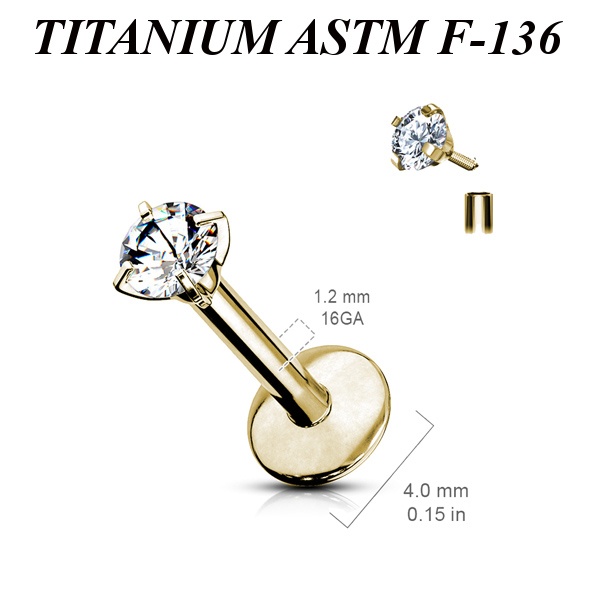 Лабрет с внутренней резьбой из имплантационного титана 6Al-4V-Eli ASTM: F-136 с PVD покрытием. Украшен прозрачным круглым фианитом в лапках.