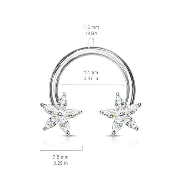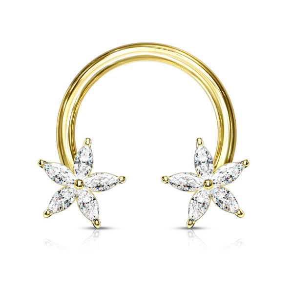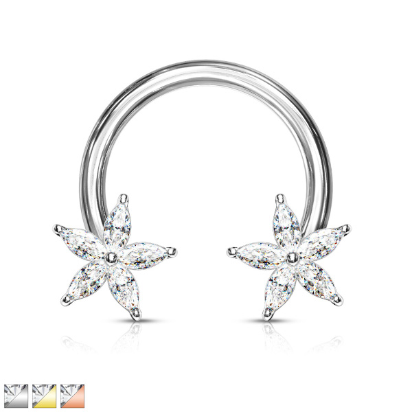 Циркуляр из хирургической стали 316L, украшен цветами из родированной латуни со стразами. Представлен также вариант с покрытием жёлтого и розового золота.