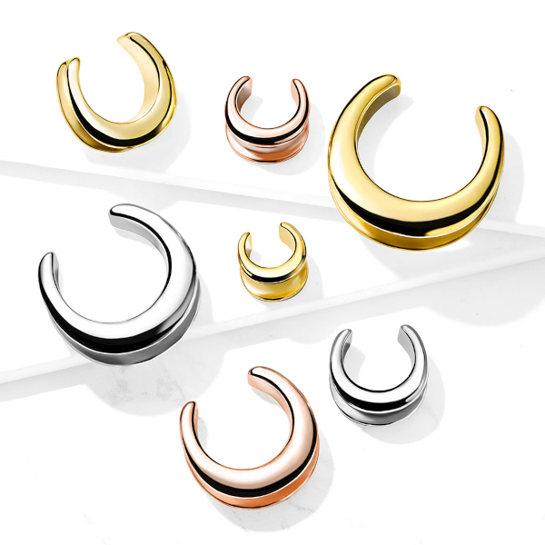 Тоннель с бортами из хирургической стали 316L в форме полумесяца. Представлены также вариации с IP покрытием жёлтого и розового золота.