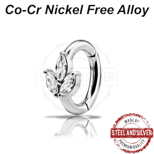 Овальный кликер из кобальт-хрома украшен тремя премиальными цирконами. Размер декоративной части - 6х8мм.