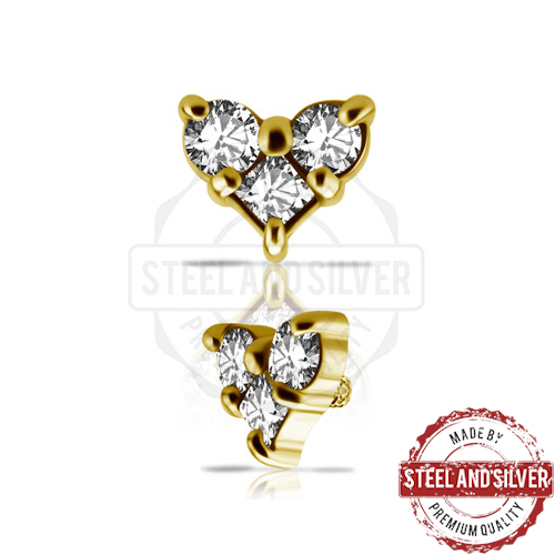 Накрутка из хирургической стали 316L с золотым 24х каратным PVD покрытием. Украшена фианитами. Размер декоративной части - 4х5мм. Резьба накруток 0,8мм подходят к украшениям толщиной 1 и 1,2мм с внутренней резьбой.