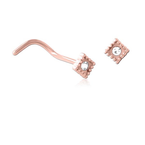 Нострил из хирургической стали 316L с PVD покрытием розового золота дополнен прозрачным кристаллом.