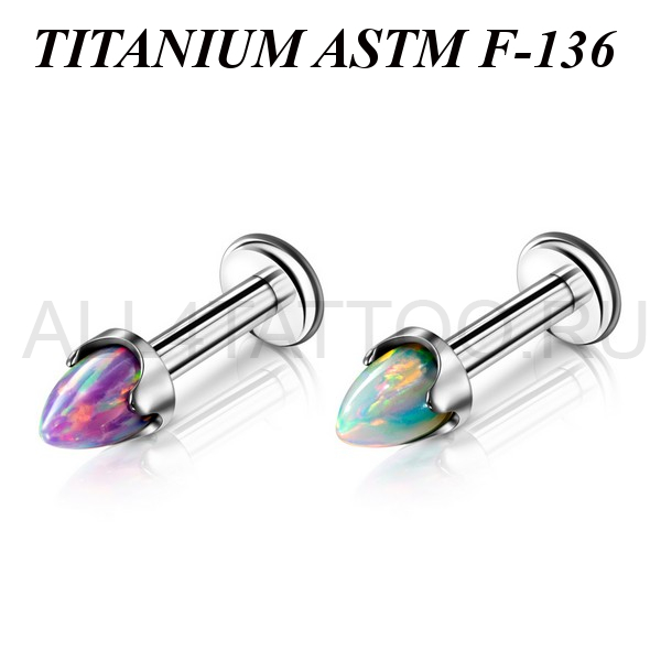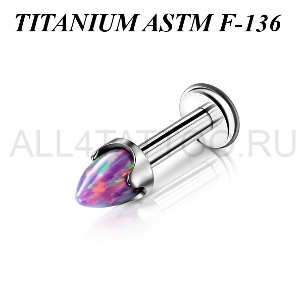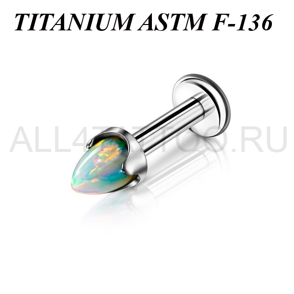 Лабрет с внутренней резьбой из имплантационного титана 6Al-4V-Eli ASTM: F-13. Украшен конусом из лабораторного опала.