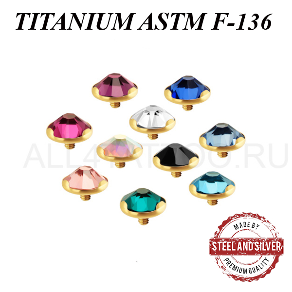 Накрутка из имплантационного титана ASTM F-136 с 24х каратным золотым PVD покрытием. Украшена премиальным кристаллом в лапках. Подходит для украшений толщиной 1,6мм с внутренней резьбой.