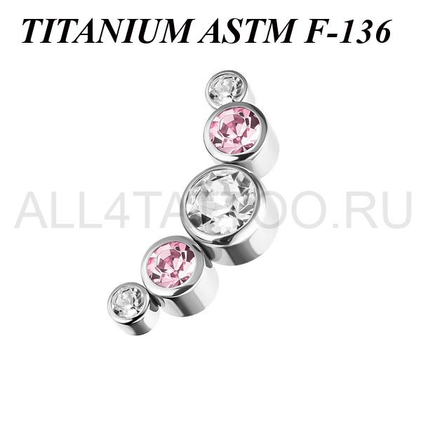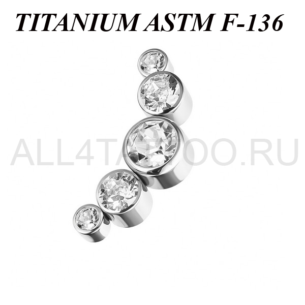Кластер из имплантационного титана 6Al-4V-Eli ASTM: F-136 украшен пятью фианитами. Размер декоративной части: 5,5х13мм. Подходит для украшений с внутренней резьбой толщиной 1 и 1,2 мм.