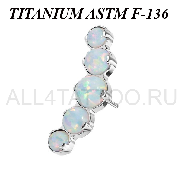 Вставка из имплантационного титана 6Al-4V-Eli ASTM: F-136 для безрезьбовых украшений. Украшена кластером с пятью опалами. Размер декоративной части: 4,5х12,5мм.