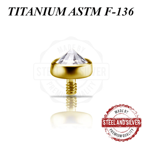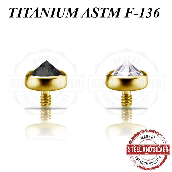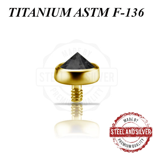 Накрутка из имплантационного титана ASTM F-136 с 24х каратным золотым PVD покрытием. Украшена кристаллом Premium Zirconia. Подходит для украшений толщиной 1,6мм с внутренней резьбой 1.2мм.