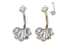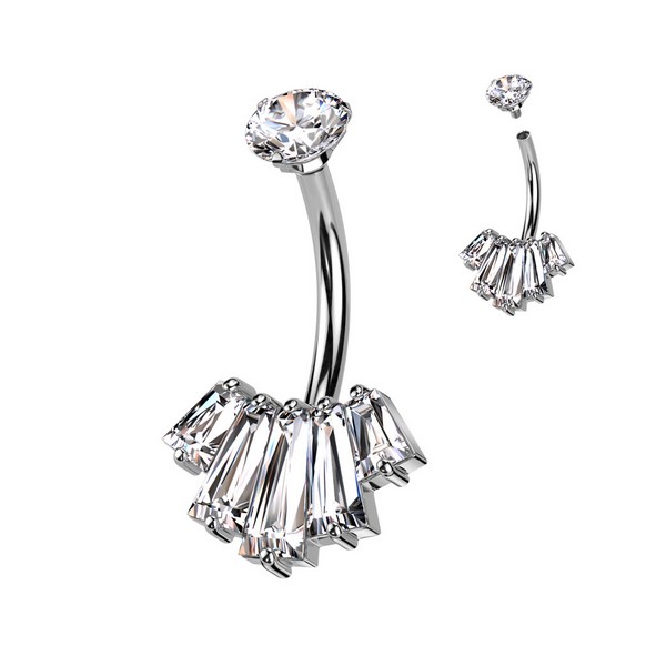 Банан с внутренней резьбой из хирургической стали 316L с декоративной частью из родированной латуни, украшенной прозрачными кристаллами. Представлен в классическом стальном варианте и с золотым PVD покрытием. Размер декоративной части: 13х9мм.