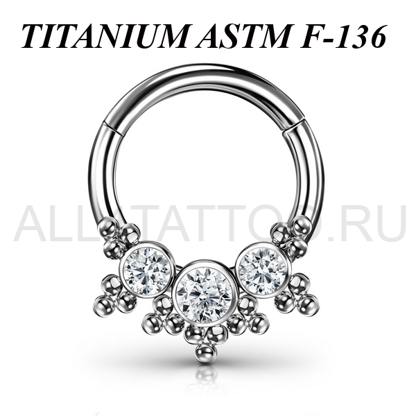 Кликер из имплантационного титана 6Al-4V-Eli ASTM: F-136. Украшен прозрачными фианитами и миниатюрными титановыми шариками.