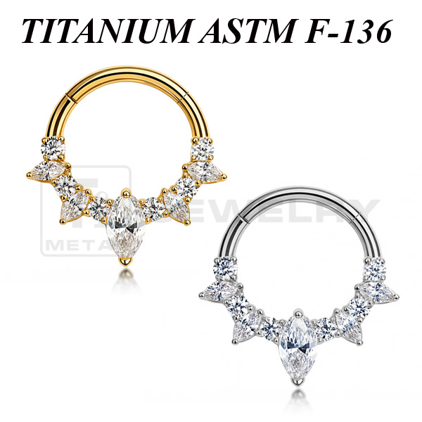 Кликер из имплантационного титана 6Al-4V-Eli ASTM: F-136 с сетом прозрачных фианитов. Представлен в двух вариантах: классический титановый и с золотым PVD покрытием.