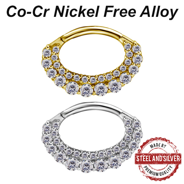 Овальный кликер из сплава кобальт-хрома, без содержания никеля. Украшен прозрачными кристаллами Premium Cubic Zirconia. Представлен так же вариант с 18-ти каратным PVD покрытием.