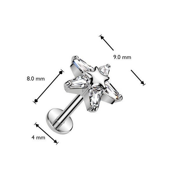 Безрезьбовой лабрет из хирургической стали 316L с декоративной частью из родированной латуни. Украшен фианитами. Представлен в двух вариантах: классический стальной и с золотым PVD покрытием. Размер декоративной части: 9х9,4мм.