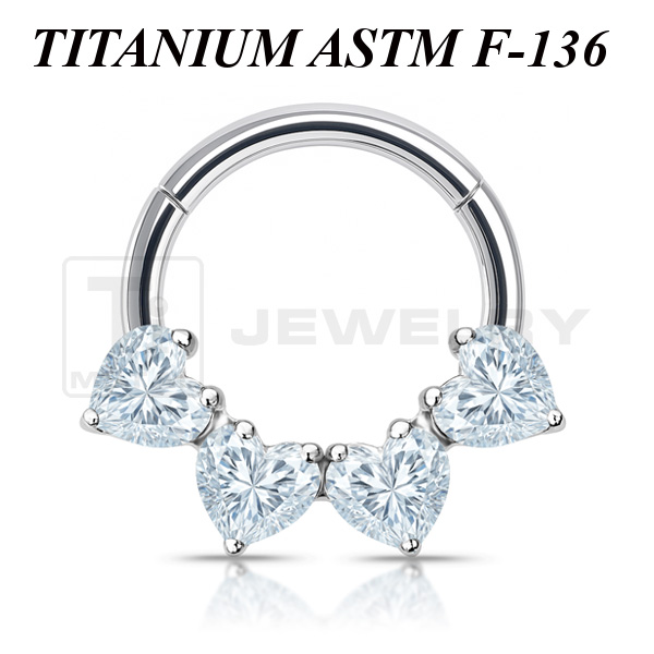 Кликер из имплантационного титана 6Al-4V-Eli ASTM: F-136 с сетом прозрачных фианитов в форме сердца.