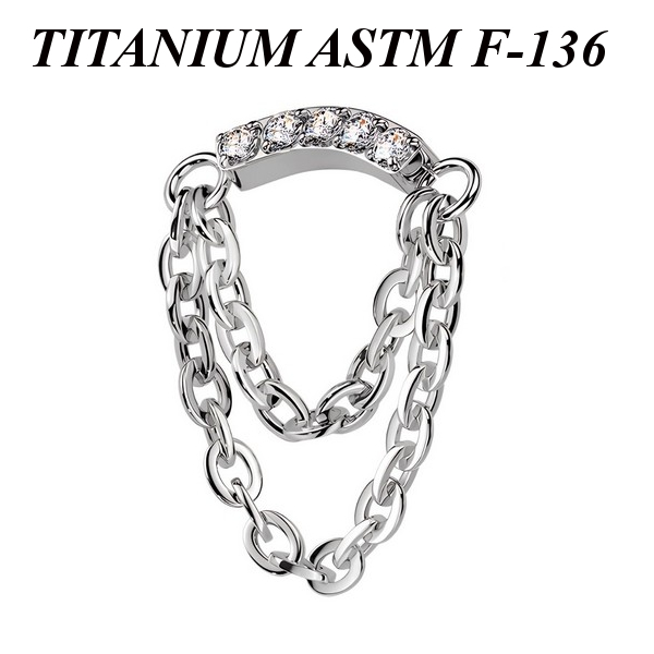 Кластер из имплантационного титана 6Al-4V-Eli ASTM: F-136. Представлен в двух вариантах: классический титановый и с золотым PVD покрытием. Украшен прозрачными фианитами. Размер кластера с учётом цепочки: 10х15,5мм. Подходит для украшений с внутренней резьбой толщиной 1 и 1,2 мм.